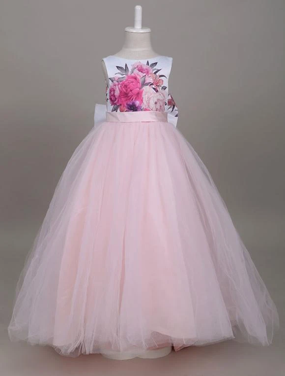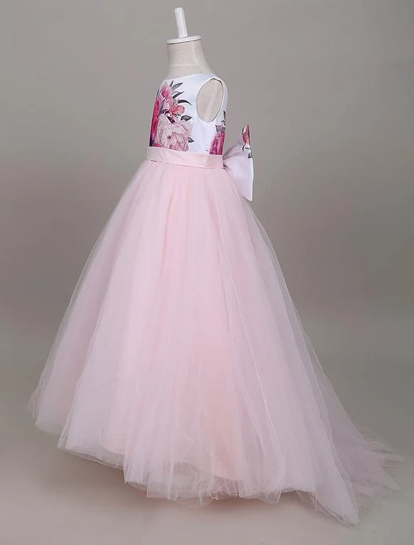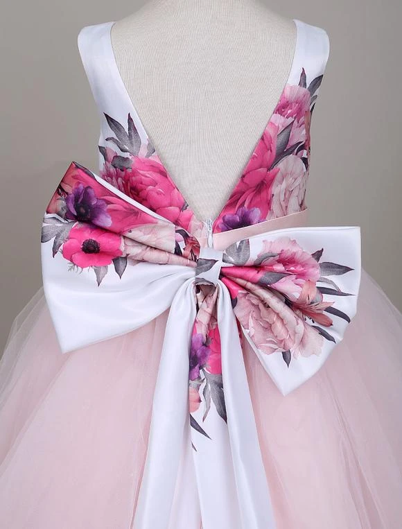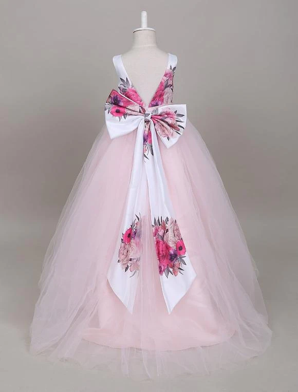 Princess Flower Girl Dresses Tulle Soft Pink Kids Pageant Dress Printed Bow Long Party Dress With Train