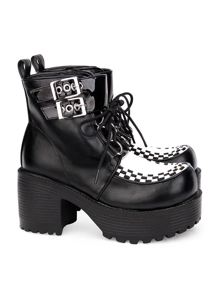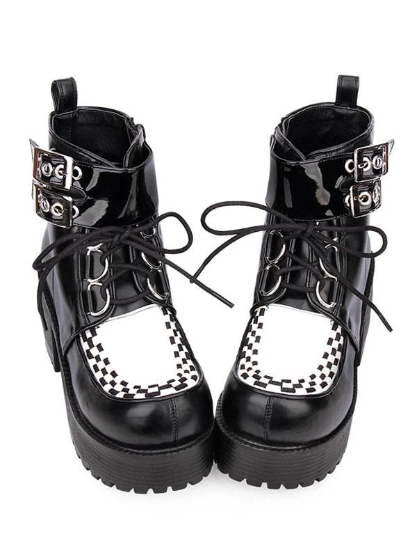 Punk Lolita Boots Metallic Buckle Lace Up PU Platform Checkered Black Lolita Booties