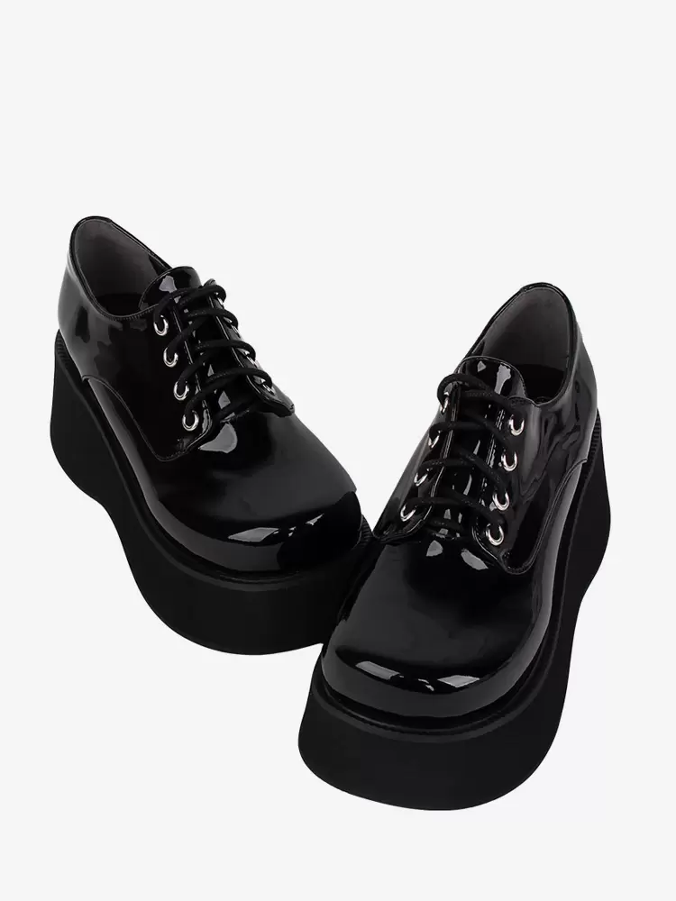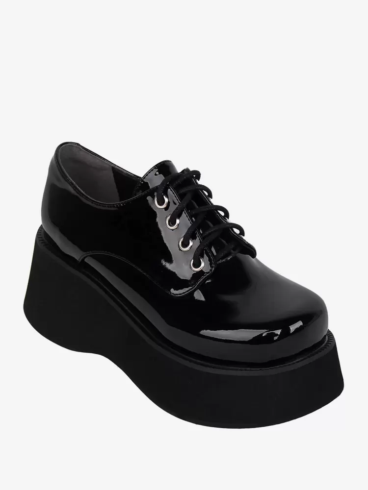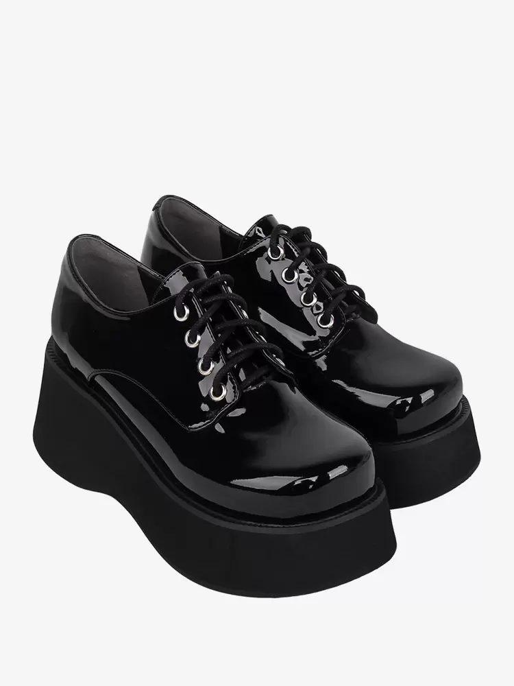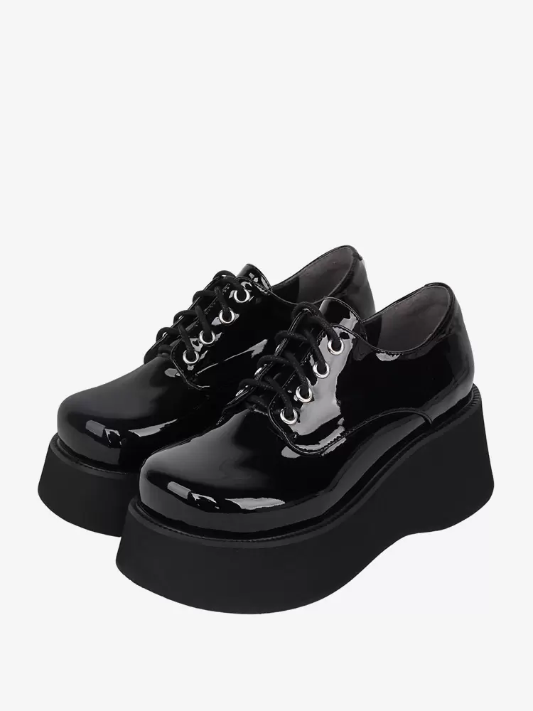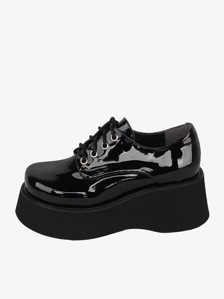 Steampunk Lolita Footwear Black Patent Leather Lace Up Round Toe PU Leather Lolita Shoes