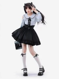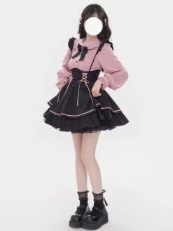 Steampunk Lolita Outfits Light Sky Blue Lace Up Ruffles Long Sleeves Blouse Skirt