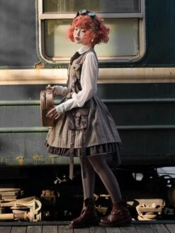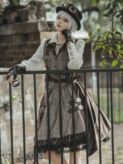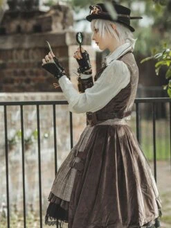 Steampunk Lolita SK 2-Piece Set Infanta Coffee Brown Metal Details Cotton Blend Velour Lolita Overskirt Outfits