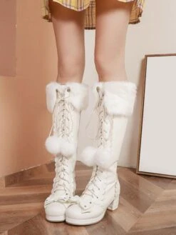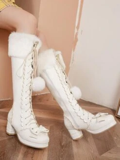Sweet Lolita Boots Bow Pom Poms Faux Fur Lace Up Lolita Footwear