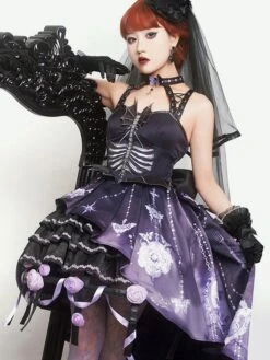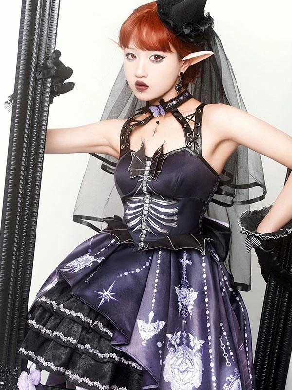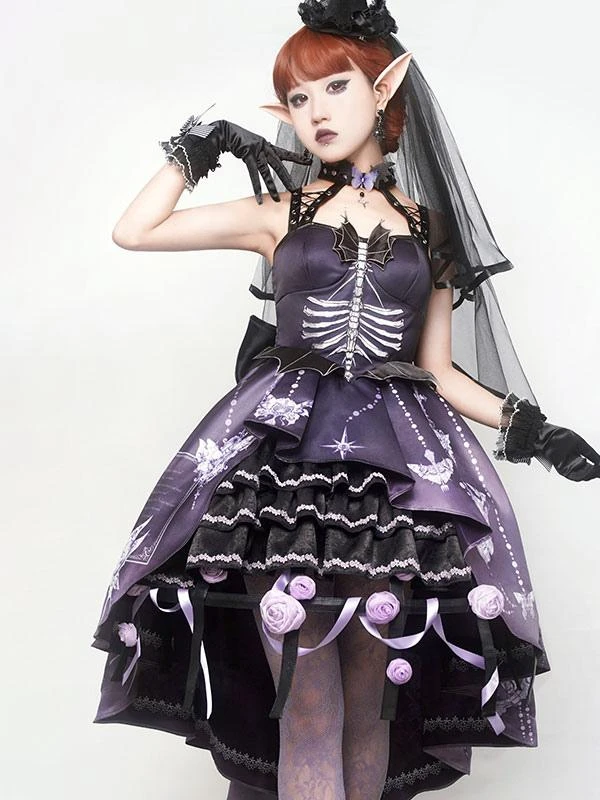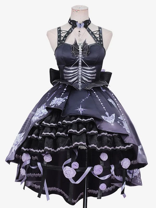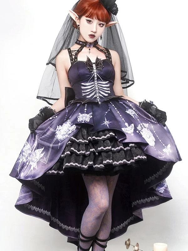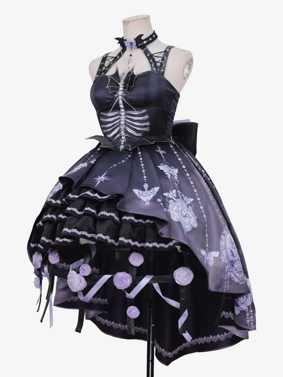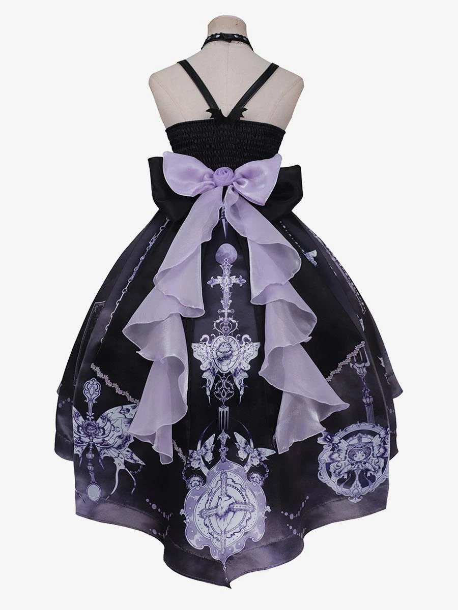 Sweet Lolita JSK Dress Floral Print Applique Bows Purple Lolita Jumper Skirts