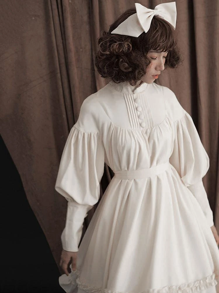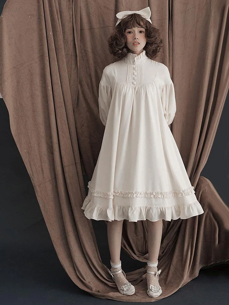 Sweet Lolita One Piece Dress Cotton Ruffle Button Ecru White Lolita OP