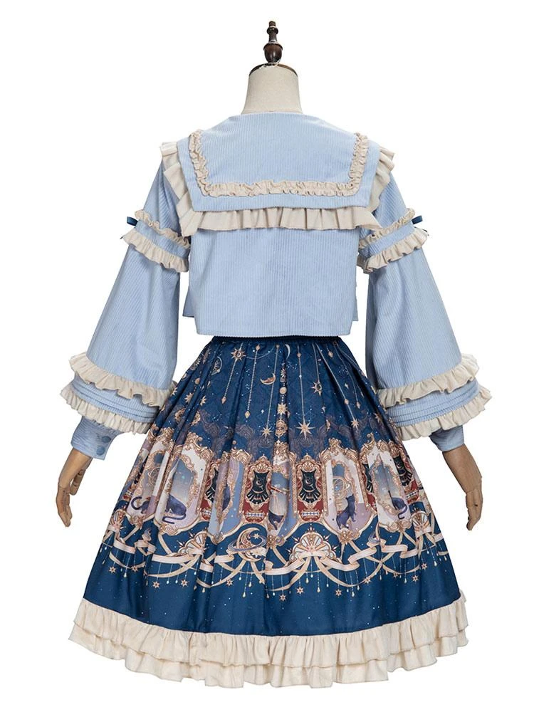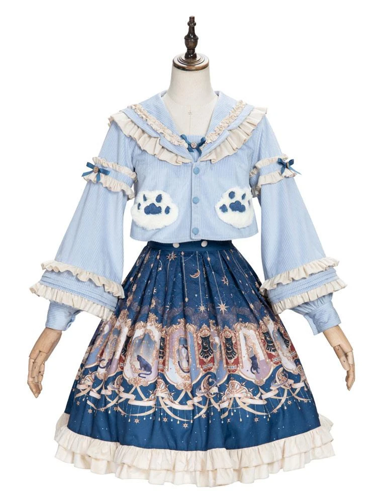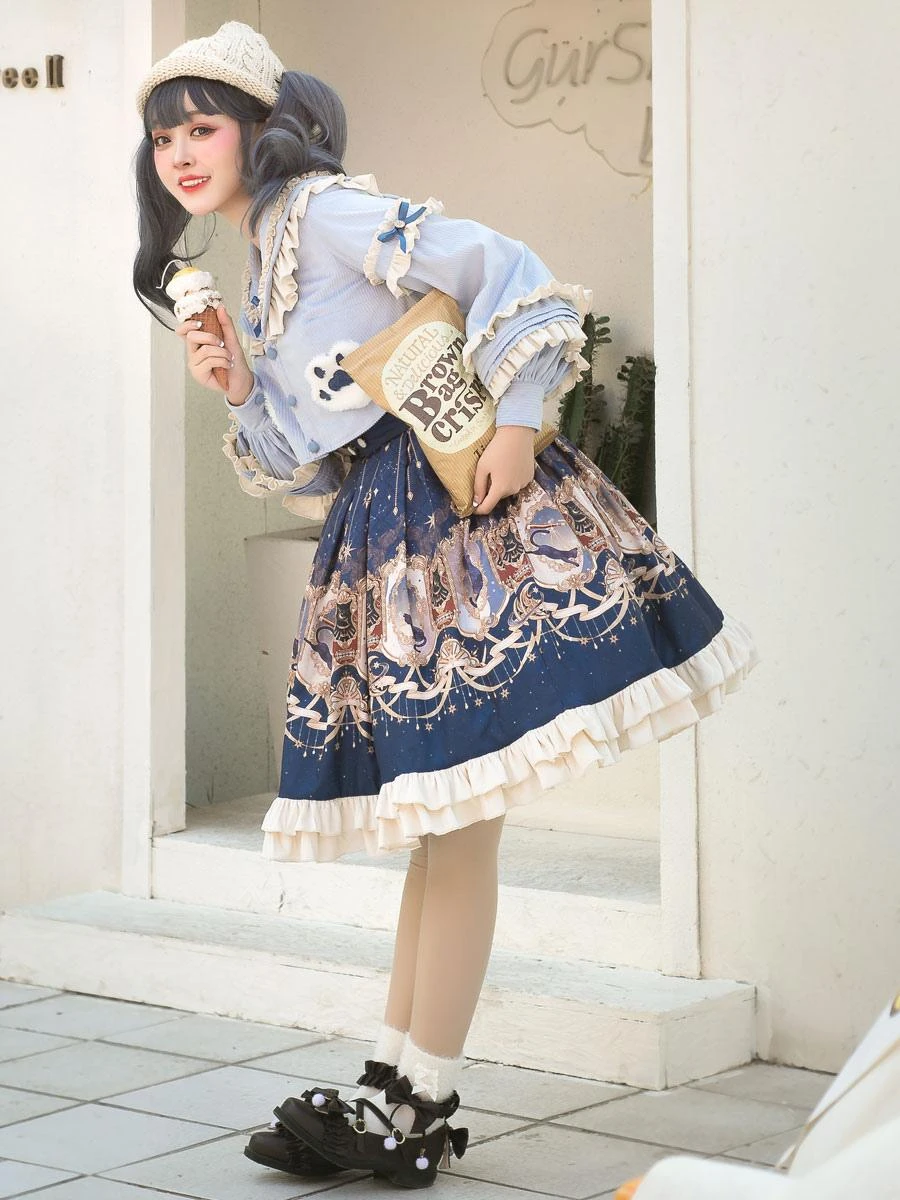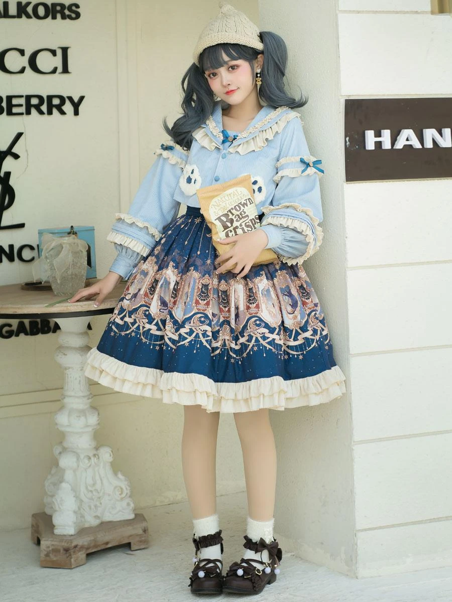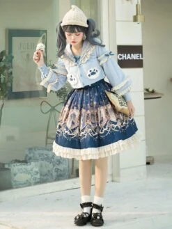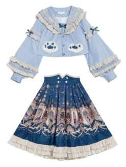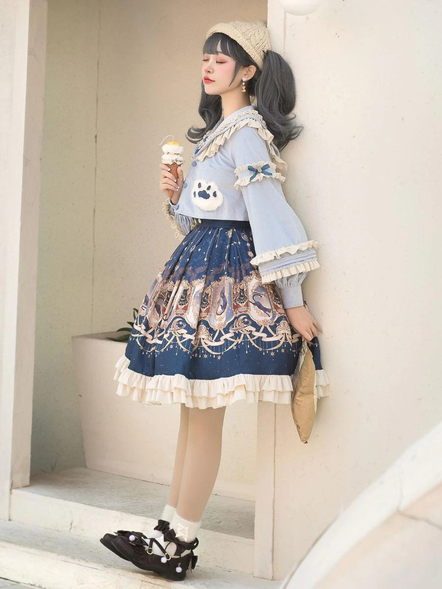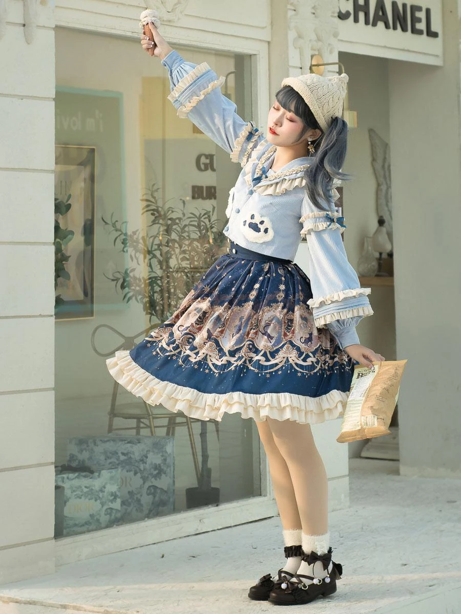 Sweet Lolita Outfits Baby Blue Animal Print Ruffles Bows Long Sleeves Top Bowknot Overskirt Set