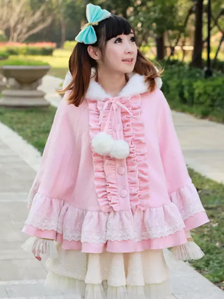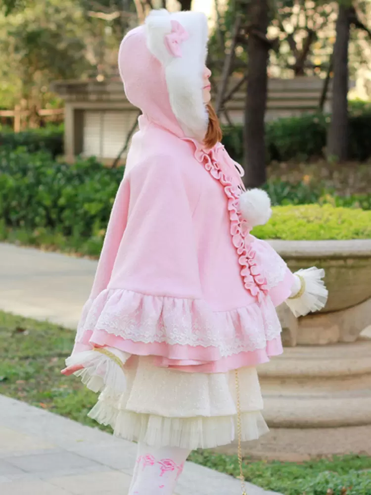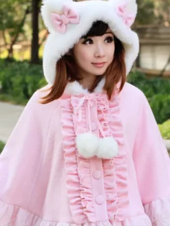 Sweet Lolita Poncho Coat Pink Hooded Cat Ear Ruffles Winter Wool Coat