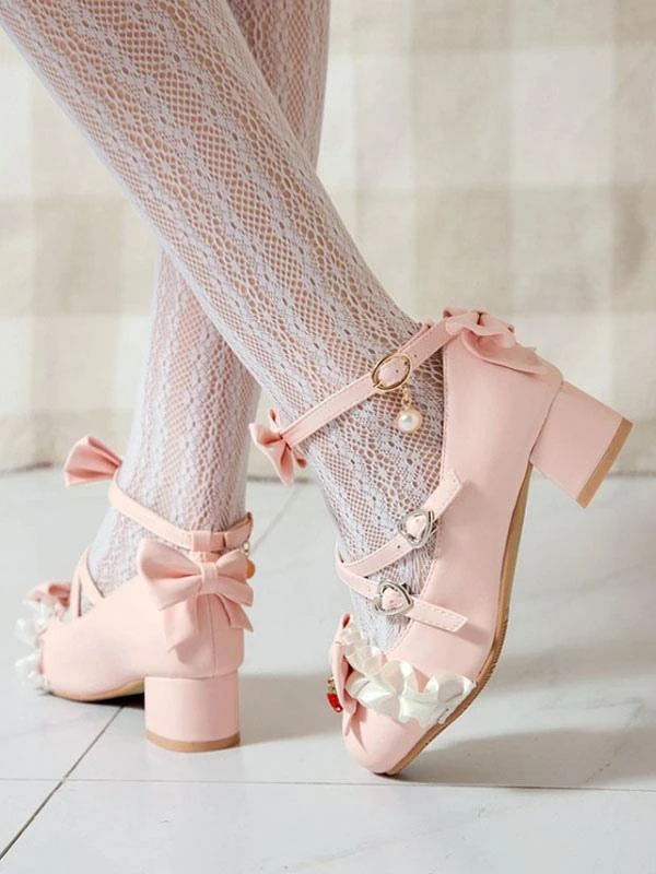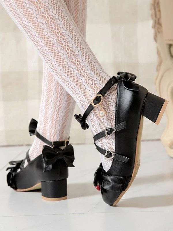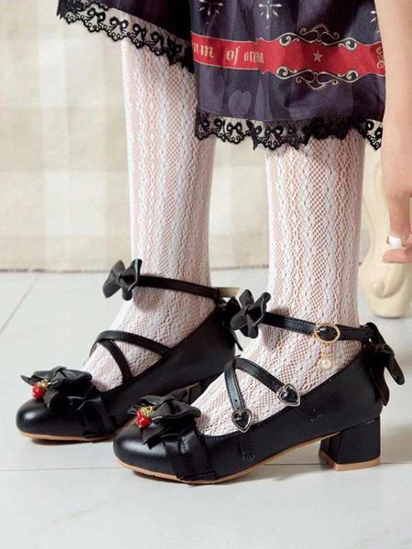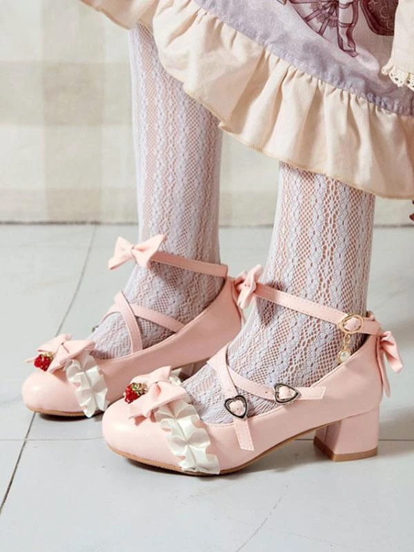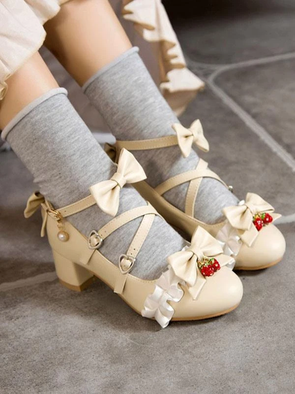 Sweet Lolita Shoes Strawberry Bows PU Leather Chunky Heel Shoes