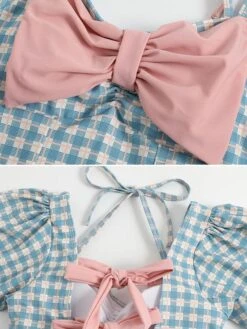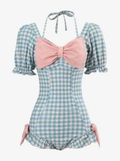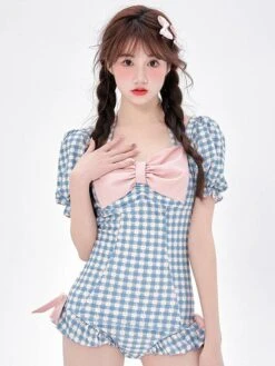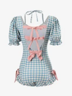 Sweet Lolita Swimsuit Light Sky Blue Plaid Bows Ruffles Short Sleeves Jumpsuit