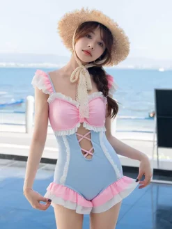 Sweet Lolita Swimsuits Pink Ruffles Bows Color Block Sleeveless Jumpsuit