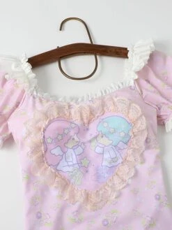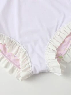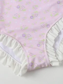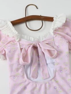 Sweet Lolita Swimsuits Pink Ruffles Floral Print Short Sleeves One Piece Hat