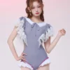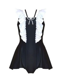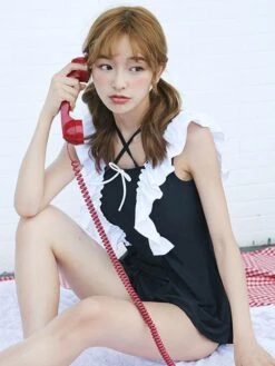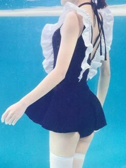 Sweet One Piece Swimsuit Backless Lace Up Ruffles Black Lolita Cute Jumpsuit For Women