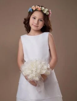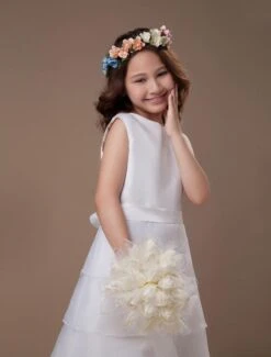 First Communion dresses are meant to be memorable – just like the service itself. This one is sure to be. It features a rounded neckline, wide straps and a ribbon waistband that ties in a pretty bow in the back. The skirt is long and made from multi-tiers of fabric that add fullness and lots in detail. The hem of the dress is slightly asymmetrical, with the back being longer than the front. A lovely gown for any little girl’s First Communion.