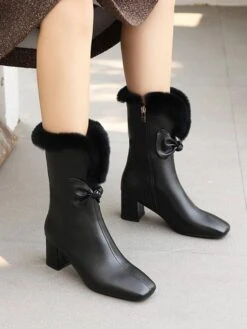 Women Ankle Boots PU Leather White Bows Square Toe Chunky Heel
